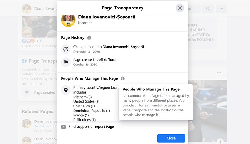 Itt van például az egyik ilyen oldal, amelynek nemes egyszerűséggel a Diana Iovanovici-Șoșoacă a neve. Látható az oldal tulajdonságaiban, hogy egy Jeff Gifford nevű egyén hozta létre 2020. október 20-án, és hogy az oldalt különböző országokbül kezelik. Ez persze nem azt jelenti, az oldalt kezelők ilyen gyakran utaznának Vietnámba, a Dominikai Köztársaságba, vagy a Fülöp-szigetekre, hanem jóval valószínűbb, hogy ottani „bér-facebookozók”, vagyis az ehhez hasonló tartalomsokszorozásból élők pénzért végzik ezt a tevékenységet.