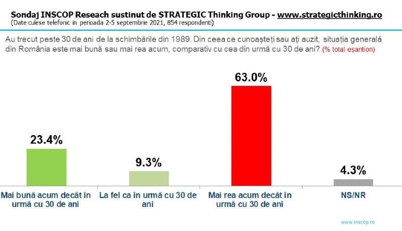 A megkérdezettek nagyon nagy többsége ugyanis úgy vélekedik, hogy ma sokkal rosszabb az ország általános helyzete, mint 1991-ben, a nemzeti kommunizmusból az „eredeti demokráciába” és a rablókapitalizmusba való átmenet kezdeti, fekete öves posztkommunisták uralta, bányászjárások tarkította időszakában.