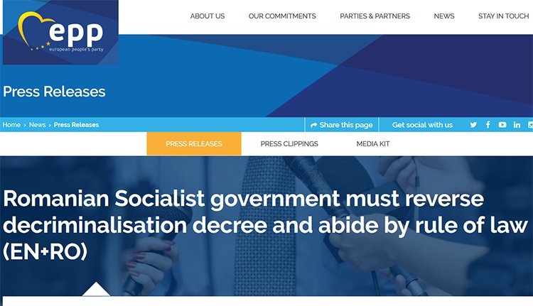 Közben az EPP elnöke, Joseph Daul azt nyilatkozta: az EP legnagyobb frakcióját alkotó európai pártcsalád felháborítónak tartja a román kormány legújabb lépéseit, amelyek gyengítik az igazságszolgáltatás rendszerét azzal, hogy sürgősségi rendelettel enyhíti a hivatali visszaélés büntetését és hogy közkegyelem alkalmazására készül.