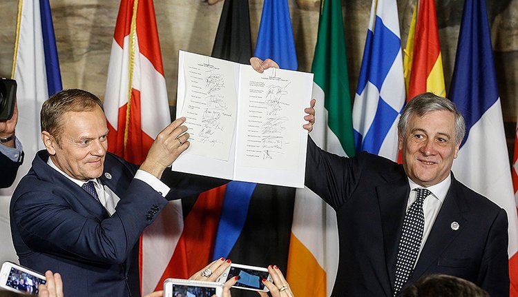 Dunald Tusk, az Európai Tanács elnöke és Antonio Tajani, az Európai Parlament elnöke az évfordulós nyilatkozattal.