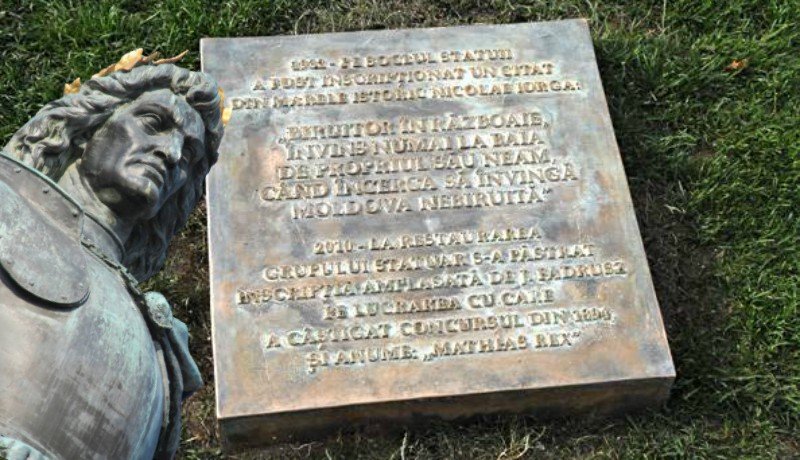 A Nicolae Iorgának tulajdonított, „A csatában győzedelmes volt, csak saját nemzetétől szenvedett vereséget Moldvabányán, amikor a legyőzhetetlen Moldva ellen indult” idézetet először 1932-ben helyezték el a szobor talapzatára. A feliratot 1940-ben, Észak-Erdély Magyarországhoz való visszacsatolása után eltávolították, de Gheorghe Funar, Kolozsvár szélsőségesen nacionalista polgármestere 1992-ben ismét feltetette. A restaurálás során a talapzatra Fadrusz János által tervezett eredeti Mathias Rex felirat került.