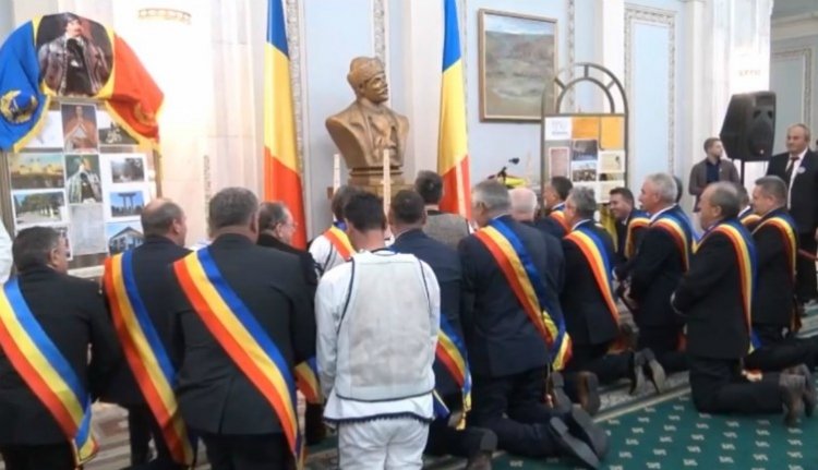 Térdepelve imádkoztak Avram Iancu ma felavatott mellszobra előtt a Nemzeti Liberális Párt képviselői.
