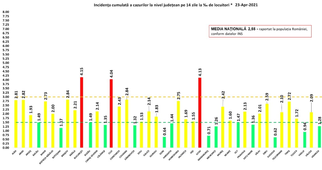 A megyei ráták is szépen csökkennek: már csak Bukarest, valamint Ilfov és Kolozs megye van a vörös küszöb felett, de már ezekben a régiókban is hamarosan 4 alá csökken az érték, ha így folytatódik a dolog.