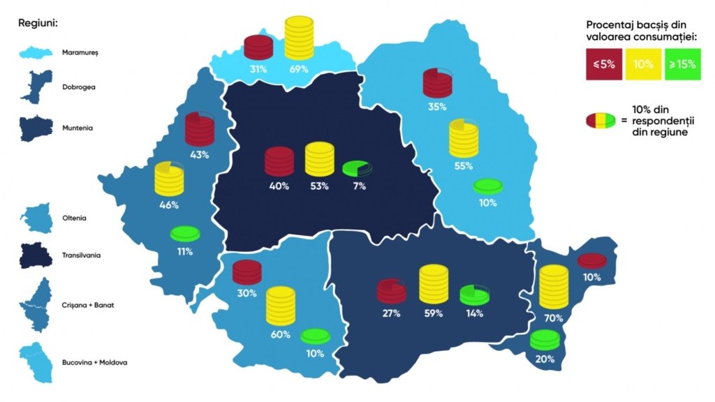 Eszerint a legbőkezűbbek a munténiaiak: 61 százalékuk mondta azt, hogy mindig hagy borravalót. Hasonlóan bőkezűek a dobrudzsaiak és a moldvaiak is, esetükben 60, illetve 59 százalékos az arány.