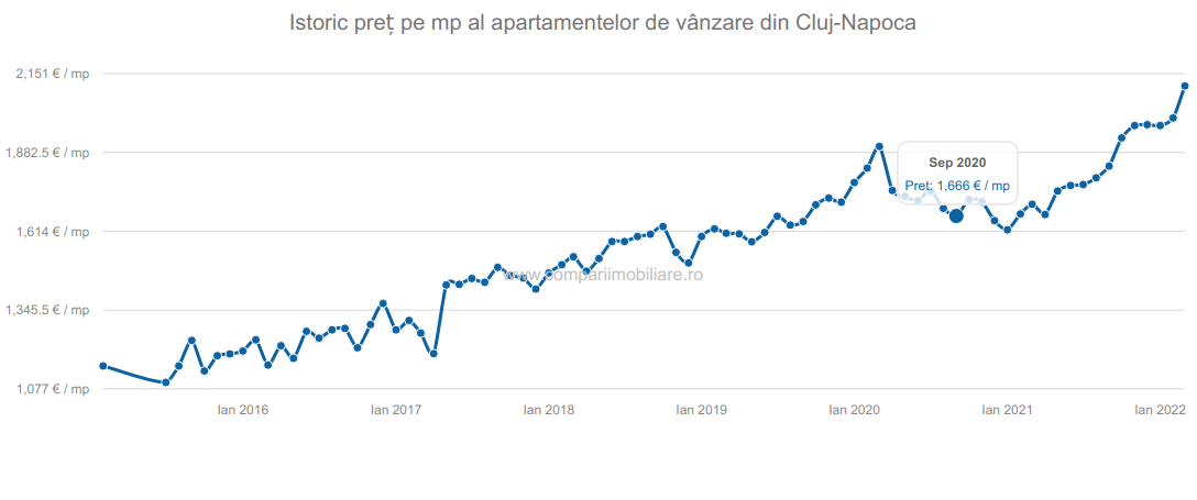 Az alábbi grafikonon jól látszik, hogy a lakások négyzetméterenkénti ára 2016 óta gyakorlatilag megduplázódott Kolozsváron.