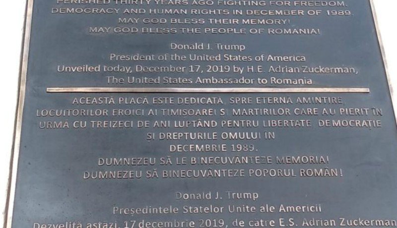 Donald Trump amerikai elnök által szignált plakettet adományozott a temesváriaknak az Egyesült Államok romániai nagykövete, Adrian Zuckerman, aki maga is részt vett a pénteki avatóünnepségen.