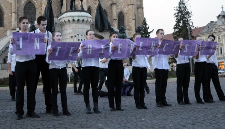 Egyformára maszkírozott színészek / színisek lepték el szombaton a kolozsvári Főteret egy negyedórás szabadtéri reklámra.