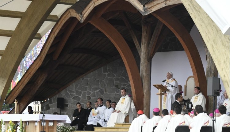 Ferenc pápa körülbelül 90 ezer hívő előtt tartotta meg szentmiséjét a csíksomlyói kegyhelyen. A mise végén a pápa elhelyezte az arany rózsát a helyszíne szállított Mária kegyszobor lábainál. Az arany rózsa a pápák különleges ajándéka, amelyet a különböző Mária-kegyhelyeknek szoktak ajándékozni a Szűzanya iránti tisztelet jelképeként. Aztán felhangzott a kontextusban (ugye, Csíksomlyó Romániában van) sok vitát és konspirációs elméletet generáló magyar himusz, amelyet a székely himnusz követett. Ám a Szentatya ezt már nem várta meg, elindult látogatásának következő állomása, Jászvásár (Iași) felé.
