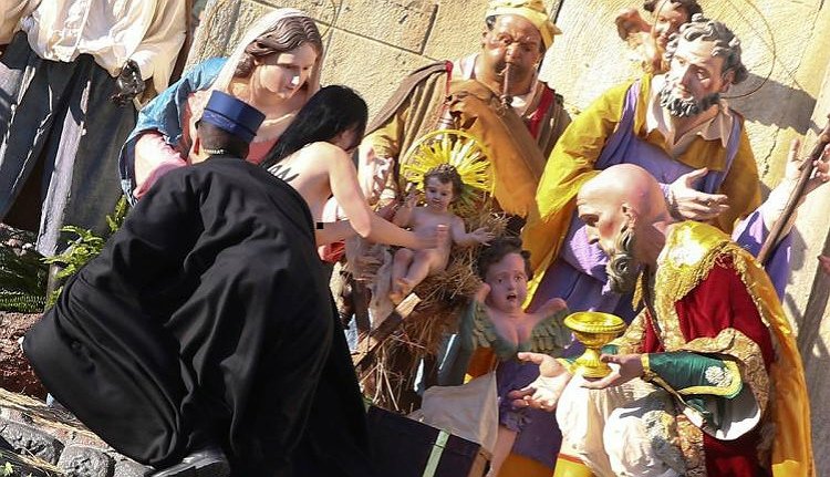 A szemtanúk szerint a FEMEN aktivistája átugrott a biztonsági korlátokon behatolt a területre, ahol a Jézus születését ábrázoló szoboregyüttest elhelyezték, és lecsapott a bölcsőben heverő kisdedre. Közben azt kiáltozta, hogy „Isten nő!”