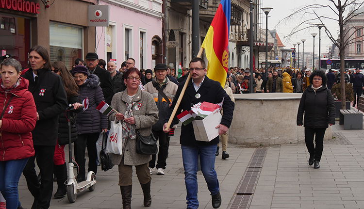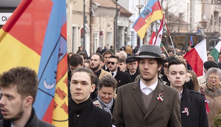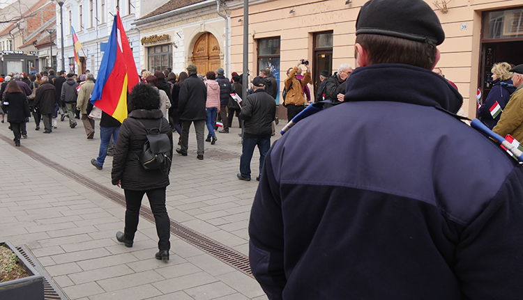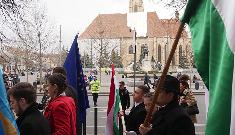 Nyugodt körülmények között, incidensek nélkül, több száz ember részvételével zajlott Kolozsváron a március 15-i ünnepség. A piros-fehér-zöld lobogókon kívül sok Erdély-zászlót is lehetett látni, idén a csendőröket sem zavarta a kék-piros-sárga címeres lobogó, mint a korábbi években.