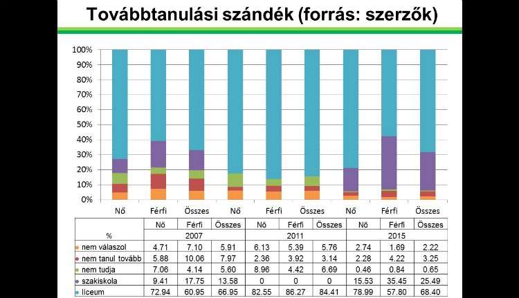 A grafikonból kiderül, hogy 2007-ben 7,97, 2011-ben 3,14 és 2015-ben 3,25 százaléknyian döntöttek úgy, hogy nem végzik el a kilencedik osztályt. 2011-es adatoknál azért szerepel 0 a szakiskoláknál, mert akkor még nem indították újra a szakoktatást.