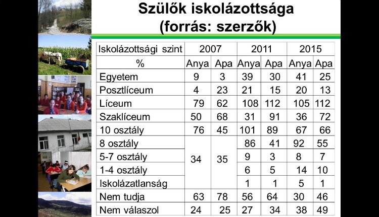 A felmérés egyik következtetése, hogy az újabb generáció tagjai magasabban képzettek lesznek, mint a szüleik. Az egyetemet végzett szülők száma azért emelkedett, mert sokan költöztek ki az olyan Kolozsvár-közeli településekre, mint Kisbács vagy Gyalu.