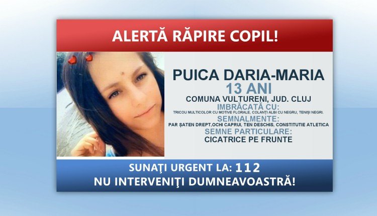 A báboci (Kolozs megye) 13 éves Daria Maria Puica vasárnap délután a helyi boltba indult, azóta nyoma veszett, és nagyon úgy tűnik, hogy elrabolták.