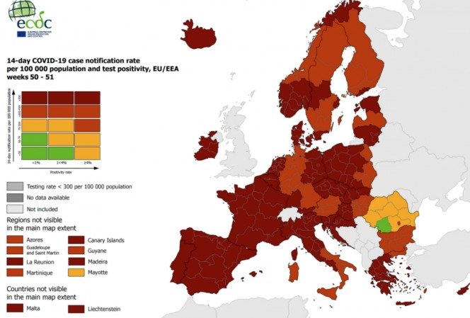 az Európai Betegségmegelőzési és Járványvédelmi Központ (ECDC) legfrissebb térképén Románia áll a legjobban az elmúlt hét adatai alapján, ugyanis Európa minden országa vörösben úszik, itt viszont még „csak” a sárga dominál, sőt még egy zöld régió is akad.