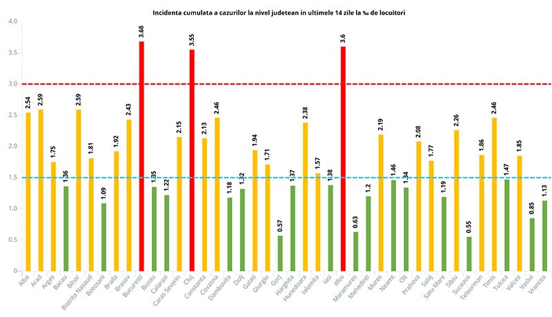 A fertőzöttségi ráta csak Bukarestben (3,68), valamint Ilfov (3,6) és Kolozs (3,55) megyében haladja meg a 3 ezreléket.