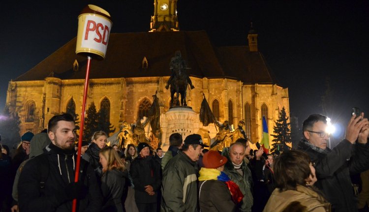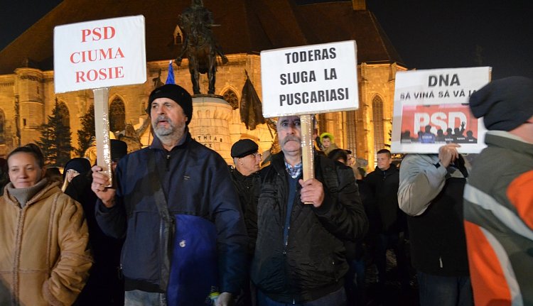 Kolozsvár központjában legalább ötezren gyűltek össze. A tüntetők zászlókat lengettek, PSD-ellenes rigmusokat skandáltak és Tudorel Toader igazságügyi miniszter lemondását követelték.