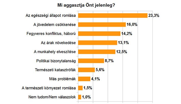 A felmérésben rákérdeztek arra is, hogy mitől tartanak a leginkább a polgárok. Ezen a listán az első helyen az egészségi állapot romlása szerepel, 23,3 százalék mondta azt, hogy ettől tart a leginkább.