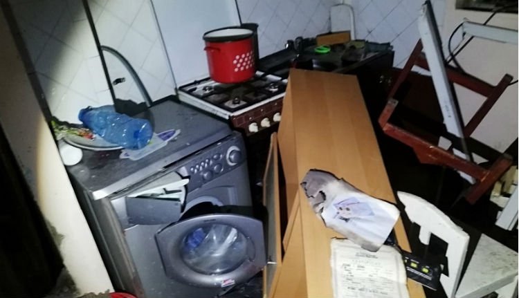 A robbanás szinte teljesen tönkretette a lakást, az ablakok kitörtek, az ajtók keretestül szakadtak ki a falból.