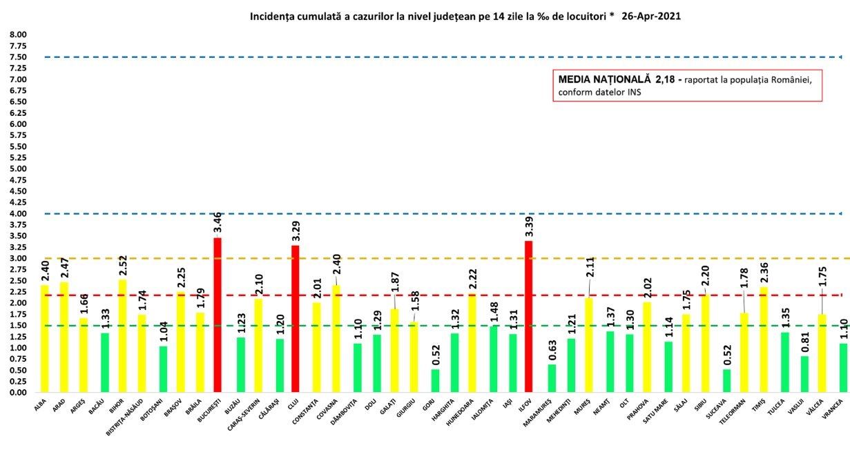 A megyei fertőzöttségi ráták is „apadnak”, Bukarestben (3,46) valamint Ilfov (3,39) és Kolozs (3,29) megyében a legmagasabb ez a szám; az összes többi megye a vörös küszöb, azaz 3 ezrelék alatt van.