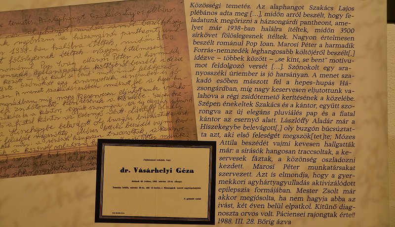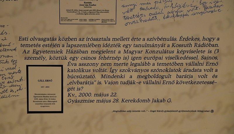 A kiállított pannókon ott van maga a gyászjelentő, mellette a kézírásos hátlap-komment, illetve annak gépelt átirata. A fenti képen a Gáll Ernő filozófus (2000-ben temették) gyászjelentőjének hátlapjára írt kommentet láthatjuk: a csinos fehérnépre tett megjezés ma simán metoo-gyanús lenne (persze, ezek a kommentek nem voltak nyilvánosak a megírásuk idején), amit pedig a baloldali gondolkodó Gáll Ernő katolikus mivoltának nem vállalásáról ír, az 2000-ben, nos, szomorú, maradjunk ennyiben.