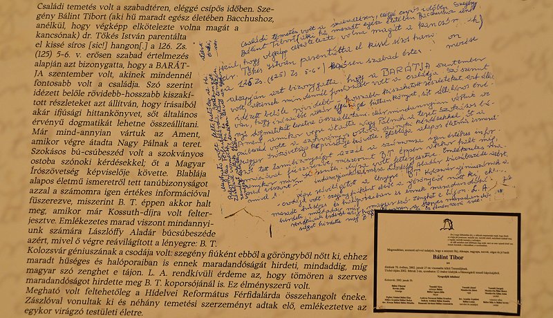 Bálint Tibor író temetése (2002) nagyobb ívű kommetárt hívott életre. Van itt is hideg, meleg: Lászlóffy Aladár pontos búcsúbeszéde pozitív, Tőkés István református lelkész vég nélküli beszéde csípősen negatív kritikát kapott Engeltől, de a többi beszélő sem úszta meg: ostoba bú-csúbeszéd, alapos blabla, ilyeneket olvashatunk. A rövid és frappáns leírás láttán a tárlatlátogató elképzeli, hogy ott van a helyszínen... és felnevet.