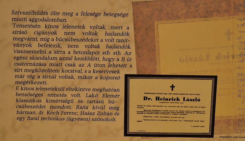 Heinrich László fizikus, tudománytörténész gyászszertartása (1985) kapcsán Engel egyrészt megjegyzi, hogy meghatóan bensőséges temetés volt, viszont ez alkalommal (is) rámutat az illetékesek (ez esetben cigány sírások), nos, időnként ma is felháborító hozzáállására: nem várták meg, amíg a gyászbeszédek befejeződtek, nem voltak hajlandók (feltehetően némi zsebpénzt vártak) visszatenni a sírra a betonlapot. Ugye, ismerős helyzet?