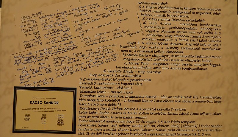 Kacsó Sándor író temetésének (1984) kommentárja még részletesebb. Kiderül belőle, hogy a szerző szerint Sütő András bombasztikus, petárdaropogtatós beszédét valaki más ugyanolyan hatásosan el tudta mondani, csak pufogtatás nélkül. Van egy ma is igen szomorúan ható megfigyelés: Kányádi Sándor roskadozott a koporsó alatt. Az éles szemű szerző azt is megjegyzi (talán a személyes gyűjtőszenvedélye okán), hogy a gyászjelentéseket lelopták a gyászlepelről. Továbbá van irodalompolitikai irónia is a szövegben: Domokos Géza beszédét Kántor Lajos elkérte tőle, abban a reményben, hogy Rácz Győző, a kolozsvári Korunk folyóirat akkori főszerkesztője, a kommunista rendszer kiszolgálója nem dobja ki.
