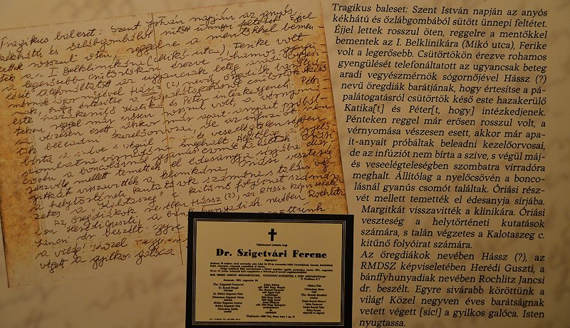 Dr. Szigetvári Ferenc nőgyógyásznak, a Kalotaszeg folyóirat szerkesztőjének gyászjelentője (1991) minden elvárásnak megfelel. Amit Engel a kommentárjában hozzátesz, az a családi és közösségi dráma: gombamérgezésben halt meg a régi barát. Idézünk: „Egyre sivárabb körülöttünk a világ! Közel negyven éves barátságnak vetett véget (sic!) a gyilkos galóca.”