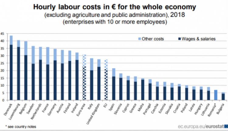 Az EU tagállamaiban 2018-ban 5,4 és 43,5 euró között változott az órabér. A legalacsonyabb Bulgáriában és Romániában, a legmagasabb pedig Dániában, Luxemburgban és Belgiumban.