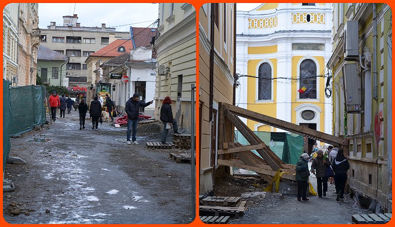 A Bolyai utcát keresztező Szentegyház (Iuliu Maniu) utcában ez a kép fogad: a két végét kivéve teljes hosszában zajlik az átalakítás. Korábban az utca főtérre néző első részét (Tükör utcának nevezi a nép, mivel a szemben álló épületek egymás tükörképei) még használhatták parkolásra, akik használhatták, újabban akadályok vannak az utca főtéri torkolatánál. Próbaképp végigmentünk a Szentegyház utcán: nem lehetetlen, bár a munkagépek itt-ott falhoz szorítják az embert.