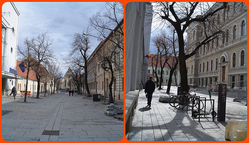 No de menjünk tovább. A kolzosvári filharmóniának otthont adó Bauhaus-épületig (és tovább, szinte a Farkas utca végéig) már kényelmes járás esik az új burkolaton. Ha az ember jobbra néz, a Színház (Emmanuel de Martonne) utcában zavartalanul zajlik a járás-kelés, itt is végeztek a munka nagyjával. Az Erdélyi Iskola szoborcsoportja éppen leszállt a magas lóról talapzatról, ennek kapcsán robbant ki a nagy szoborbotrány, amelyről itt meg itt olvashatók véleményanyagaink. A legújabb fejlemény az, hogy a városbíró elrendelte a talapzat visszavarázslását a szobor alá. Amelyhez, ugye, adott esetben fel kell szedni a burkolatot stb.