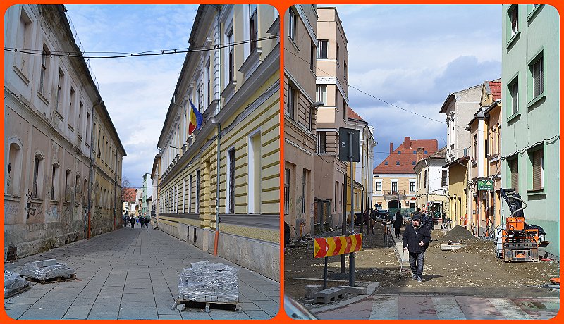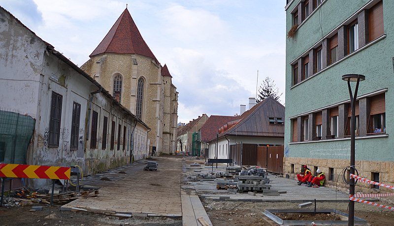 A református templom előtti tér, amelyet egy ideje Kálvin János (Piațeta Jean Calvin) térnek nevezünk, közepén a Szent György szoborral, ahogy mondani szokás, munkában van (lásd a vezető képet). Ha azonban, az irányt tartva, jobbra nézünk, megcsodálhatjuk az egyik utcát, ahol a munka dandárja már átvonult. Ez a Sámi László (Gaál Gábor) utca, a végén az Apáczai Csere János líceummal.