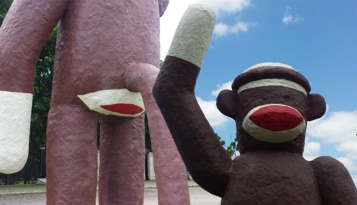 1. A legviccesebb műalkotás a fenti fotón is látható Nelson, a Zoknis Majom (Nelson, the Sock Monkey). A méretes állat Kolozsvár és az amerikai Rockford testvérvárosi viszonyának 10. évfordulója alkalmából került a Szamos-partra.