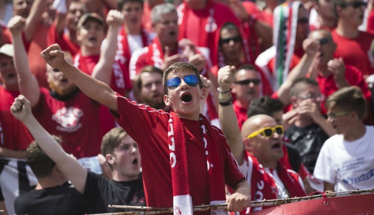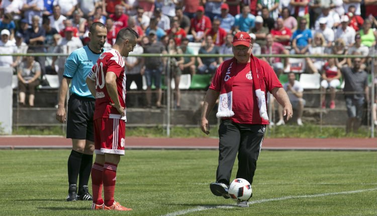 Bőr Misi, a feljutást elsőként megjósoló szurkoló kapta ajándékba a kezdőrúgást.