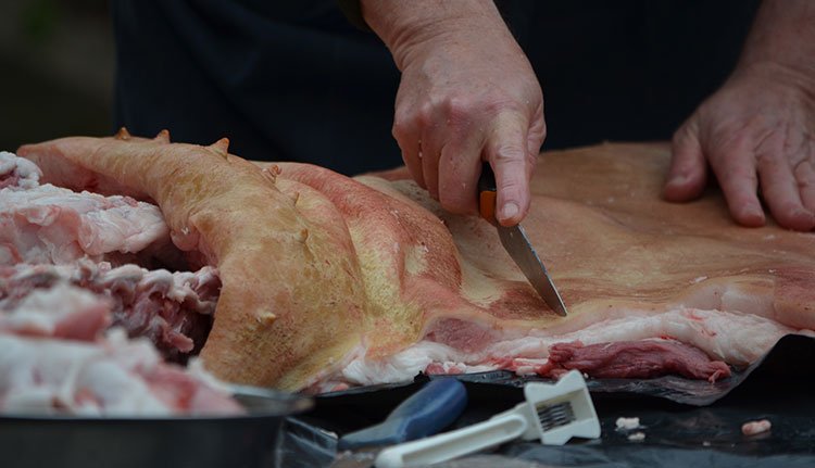 Hozzáértő mesterek és segédek keze alatt perceken belül süthető és főzhető részekre bomlik a megboldogult disznó,...