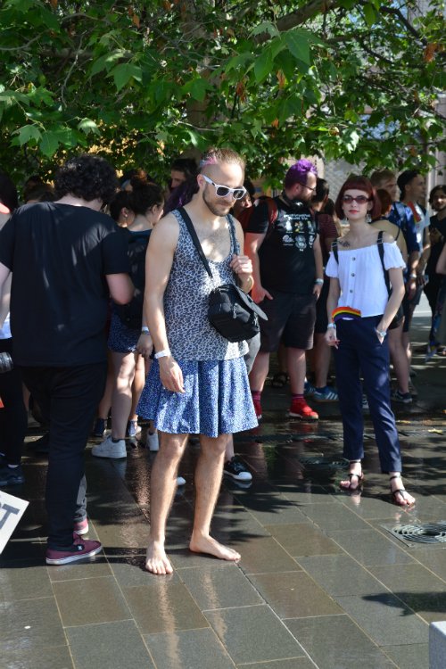 Ez az úriember kicsit meghökkentő látvány volt, amint enyhén elveszett tekintettel téblábolt a szivárványos tömegben.