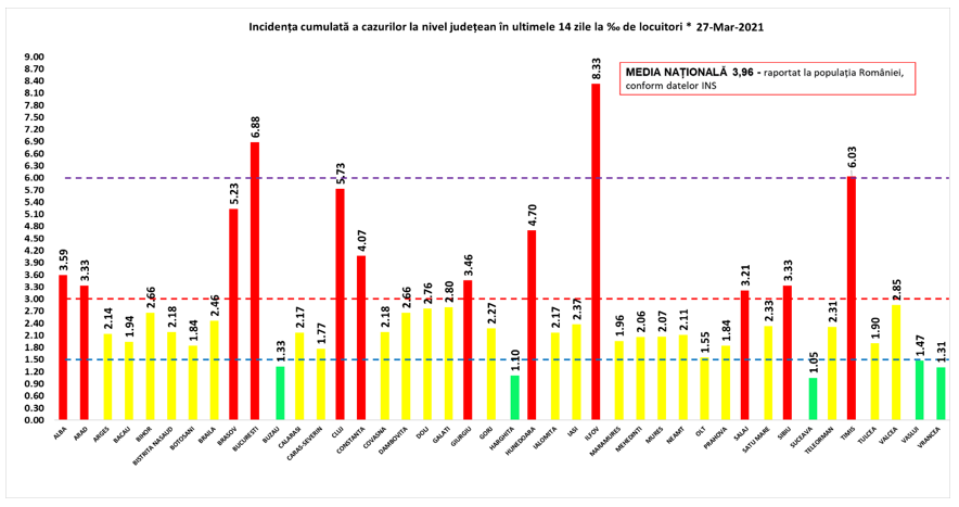 A lakosságarányos fertőzési ráta Ilfov megyében a legmagasabb (8,33 ezrelék), a legalacsonyabb Hargita (1,10 ezrelék) és Szucsáva (1,01 ezrelék) megyében. Tizenkét megyében érvényes a vörös forgatókönyv. A legtöbb új esetet Bukarestben (864), Ilfovban (356) és Kolozs megyében (301) regisztrálták.