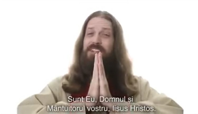 a képen pedig a román nyelvű felirat fut. És, hogy tévedés ne essék, a színész ki is jelenti magáról: ő Isten fia, akinek a feltámadását nemrég ünnepelték, és akinek speciális üzenete van kifejezetten a román nép számára. Ha jobb országot, jobb oktatást, tisztább kórházakat, járhatóbb utakat, erősebb gazdaságot és kevesebb korrupciót akarnak, ne csak imádkozzanak érte, mert nem tud segíteni.