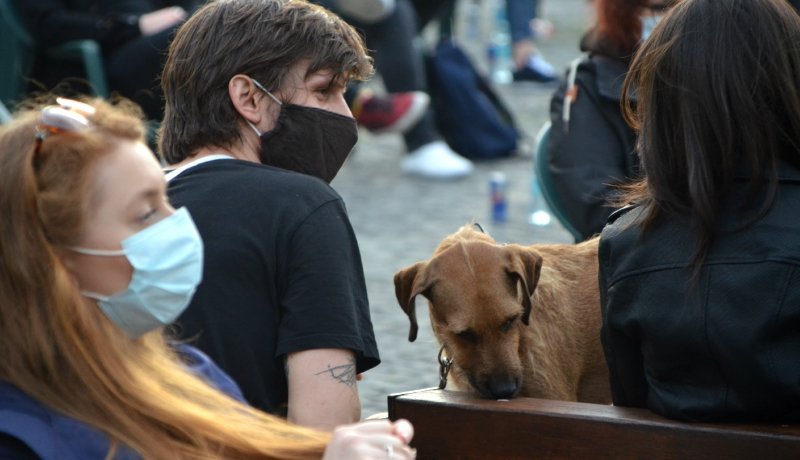 Itt egy kép, amely a régi szép időkre emlékeztet. Emberek egymás mellett, kutyus, jó hangulat. És maszkok.