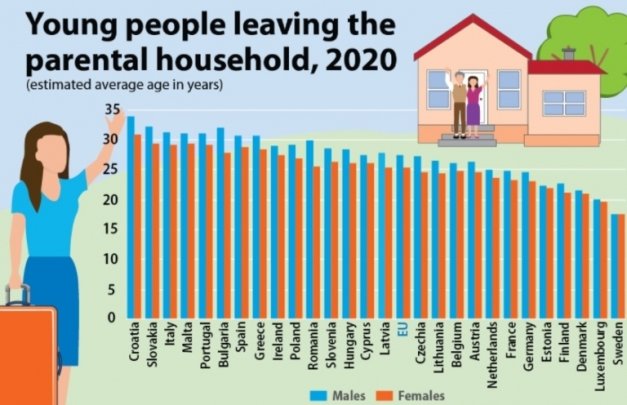 A legjobban a horvátok szeretik a szülői ház melegét: ott átlagosan 32,4 évesen költöznek saját fenntartású otthonba, de a szlovákok sem sokkal maradnak le a maguk 30,9 évével. A harmadik helyen a máltaiak és az olaszok állnak 30,2 évvel, őket nem sokkal lemaradva a portugálok követik, 30 éves átlag életkorral.