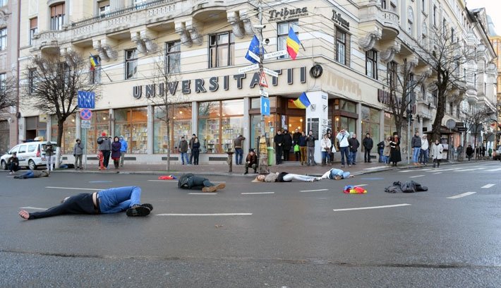 Vérfagyasztó performansz keretében újrajátszották a 25 évvel ezelőtti kolozsvári vérengzés tragédiáját.