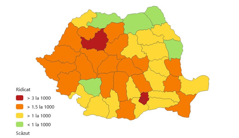 A legnagyobb fertőzöttségi ráta továbbra is Bukarestben van (3,25 ezrelék), következik Ilfov (3,2) és Kolozs megye (3,15).