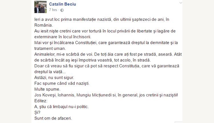 A finom lelkületű Cătălin Beciu szerint a részleges közkegyelemről és amnesztiáról szóló jogszabályok elleni szerdai demonstrációk „az első náci tüntetések voltak az utóbbi hetven évben Romániában”.