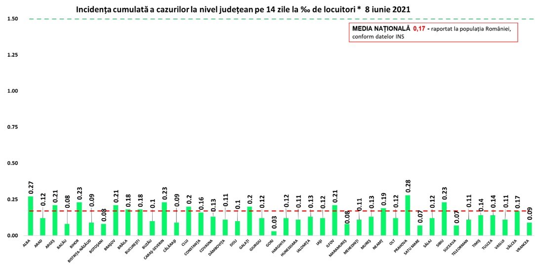 A megyei fertőzöttségi ráták továbbra is csökkennek, jelenleg Prahova megye van az élen 0,28 ezrelékkel, a sokáig „csúcstartó” Fehér megye pedig 0,27-el a második.