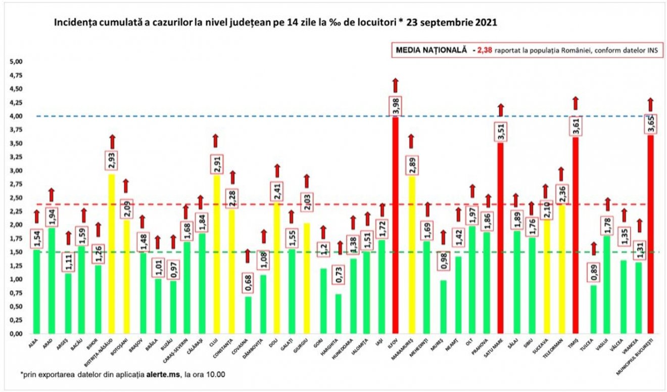 Közben a megyei fertőzöttségi ráták is masszívan emelkednek: Bukarest mellett Temes, Szatmár is Ilfov megye már bevörösödött (utóbbi hajszál híján a 4 ezreléket is átlépte), de Beszterce-Naszód, Kolozs és Máramaros megye is hamarosan átlépi a 3 ezrelékes vörös határt.