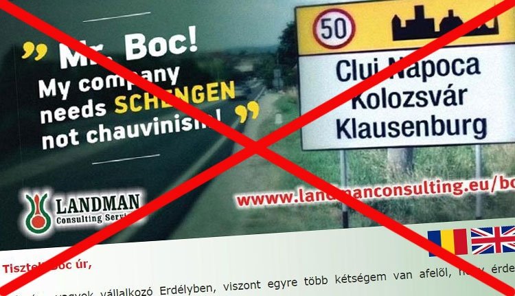 Gyalu közelében kihelyezett óriásplakáton és nyílt levélben kéri számon az európai integrációt Emil Boc-on, Kolozsvár polgármesterén és volt miniszterelnökön Landman Gábor, aki fel is ajánlja, hogy alapítványa kihelyezi Kolozsvár bejárataihoz a háromnyelvű helységnévtáblákat. A számonkérés természetesen többnyelvű.