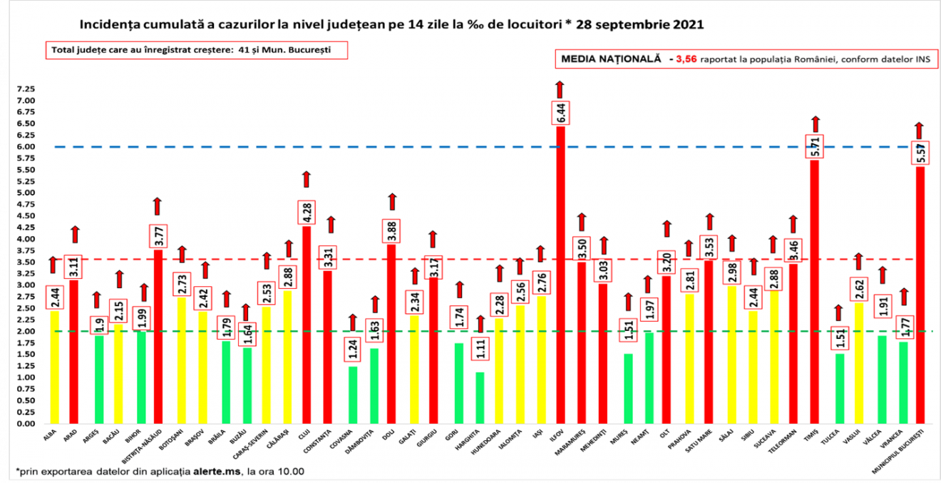 Csak Bukarestből 1912 fertőzéses esetet jelentettek, de Temes (564) és Kolozs megye (396) is élen jár ebben. Bukaresten kívül már 13 megye „vörösödött be” a fertőzöttségi ráta alapján, Ilfov továbbra is vezet (ezer lakosra 6,44 beteg jut), második Temes megye (5,71), megelőzve Bukarestet (5,57). A legkevesebb új esetet Kovászna, Hargita és Tulcea megyéből jelentették, ezekben a megyékben a legkisebb a fertőzöttségi ráta is, alig haladja meg az 1 ezreléket.