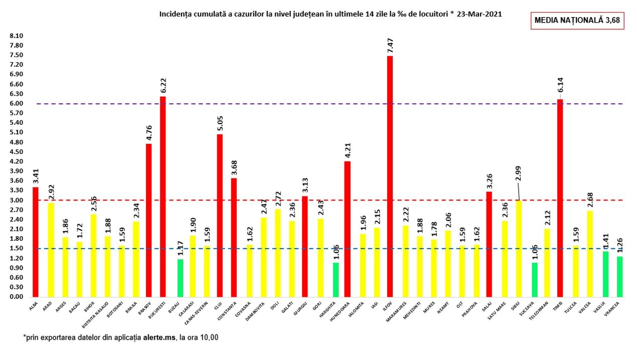A lakosságarányos fertőzési ráta is folyamatosan romlik: Bukaresttel együtt már 10 megye van a vörös határ (3 ezrelék), ebből három (Ilfov, Bukarest, Temes) pedig 6 ezrelék fölött.