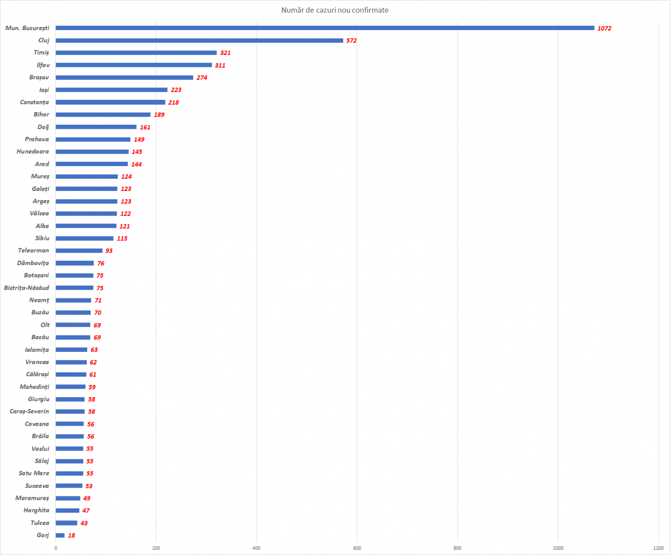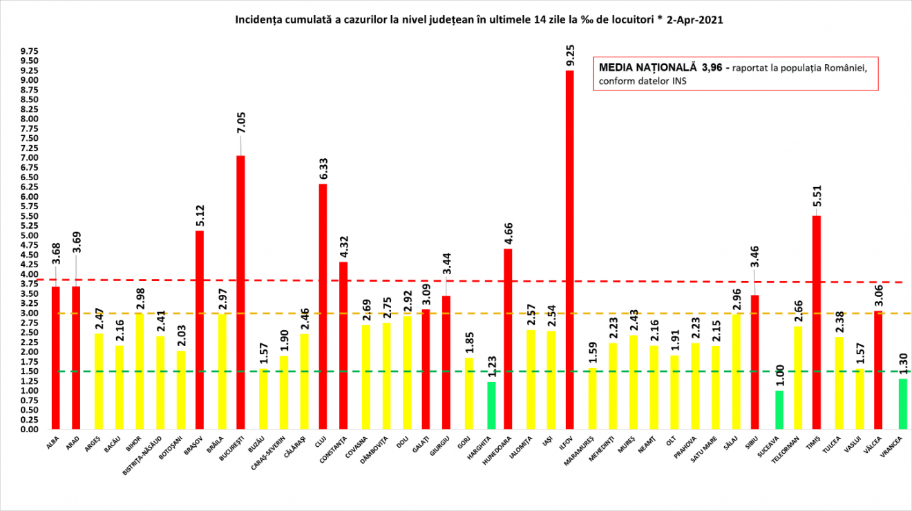 Ami a fertőzöttségi rátát illeti, jelenleg Bukaresttel együtt összesen 13 megye van a vörös küszöb, 3 ezrelék fölött, Ilfov (9.25) még mindig magasan veri a mezőnyt.