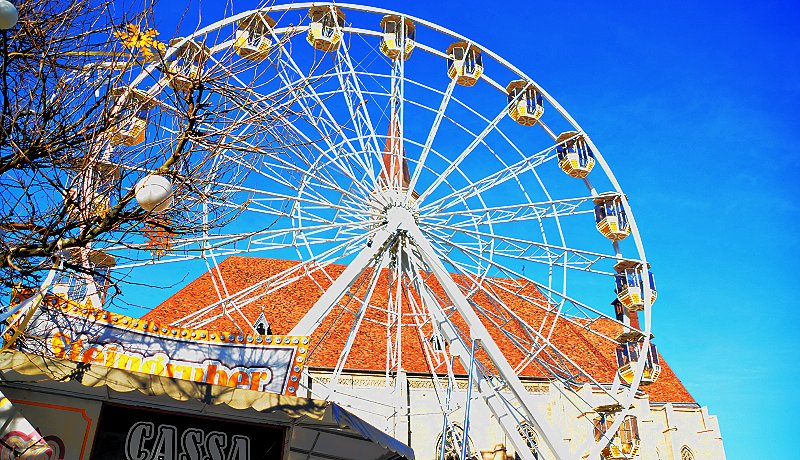 Na de mi van a nagy verejtékkel többnyelvűsített karácsonyi kapuk mögött? Ami az arra járónak azonnal kiveri a szemét: egy óriáskerék. Megnéztük, az a neve, hogy Vác Eye Óriáskerék. (Ne is tessék kérdezni, miért pont Vác Eye.) Többeknek az volt a bajuk ezzel a vidámparki szerkezettel, hogy jaj, idén odarakták a Szent Mihály templom elé, hát miért kellett ezt. Nos, az a véleményünk, hogy nem is jártak el oktondi módon. A templomot, ugye, nemrég újították fel. Mi lehetne jobb eszköz arra, hogy 30 kemény lej befizetése ellenében jó magasról megnézzük a napsütésben (mikor van, persze) ragyogó nagytemplomot? És ha megkeressük a megfelelő szöget, pont úgy néz ki, mintha a kerék a tornyon függne, hát nem?